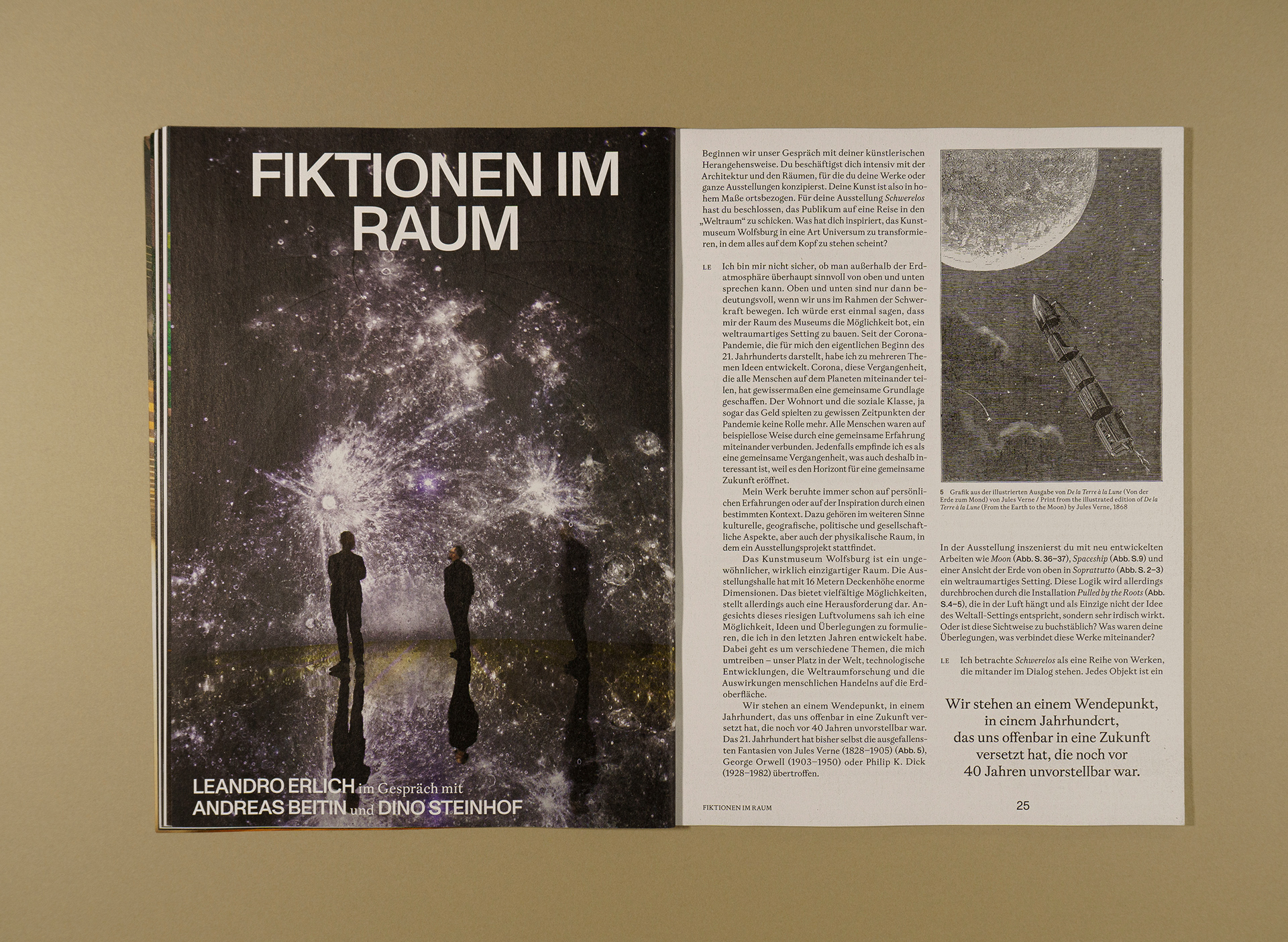 Jan Kiesswetter and Sascha Fronczek designed collaboratively the booklet »LEANDRO ERLICH. SCHWERELOS / WEIGHTLESS« for the Kunstmuseum Wolfsburg The booklet contains photos of the exhibition in the Kunstmuseum Wolfsburg, Essay and Interviews about and with Leandro Erlich. Essays and interviews by Andreas Beitin and Dino Steinhof.